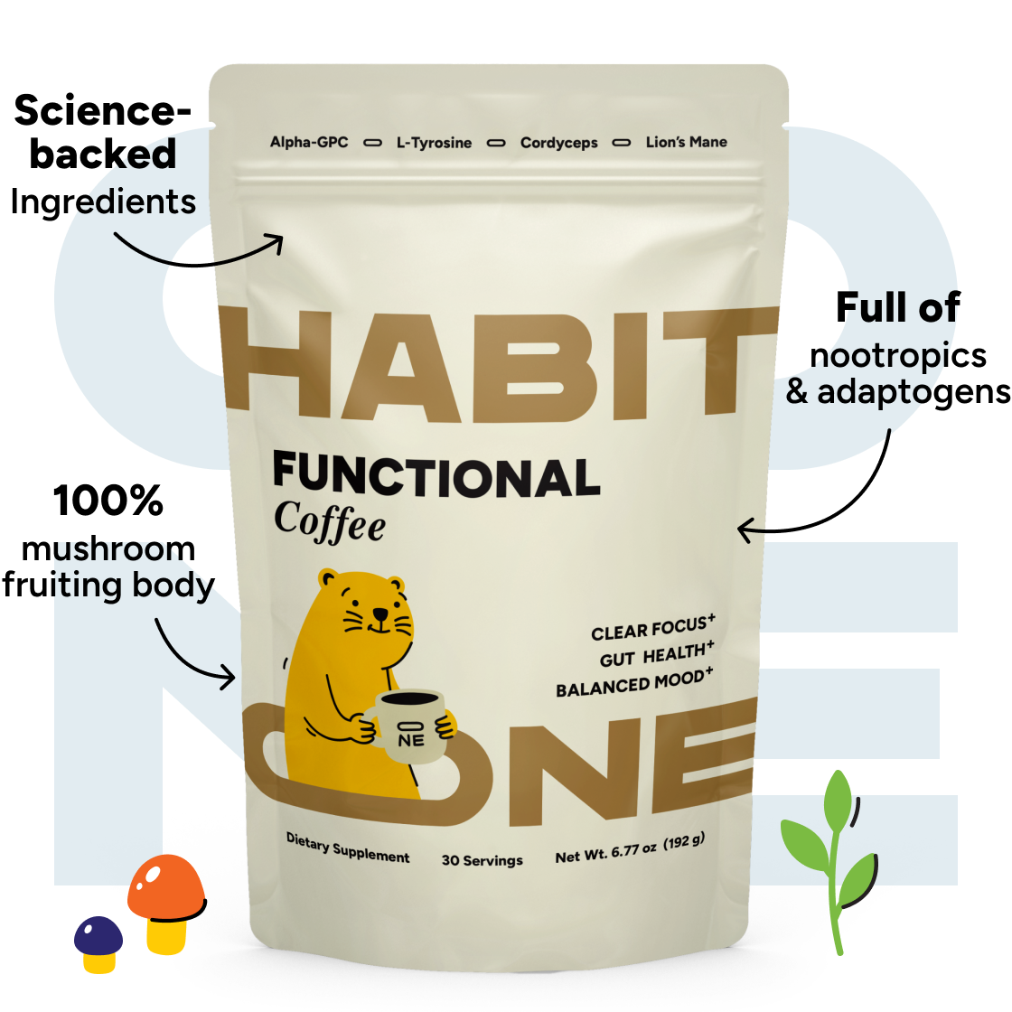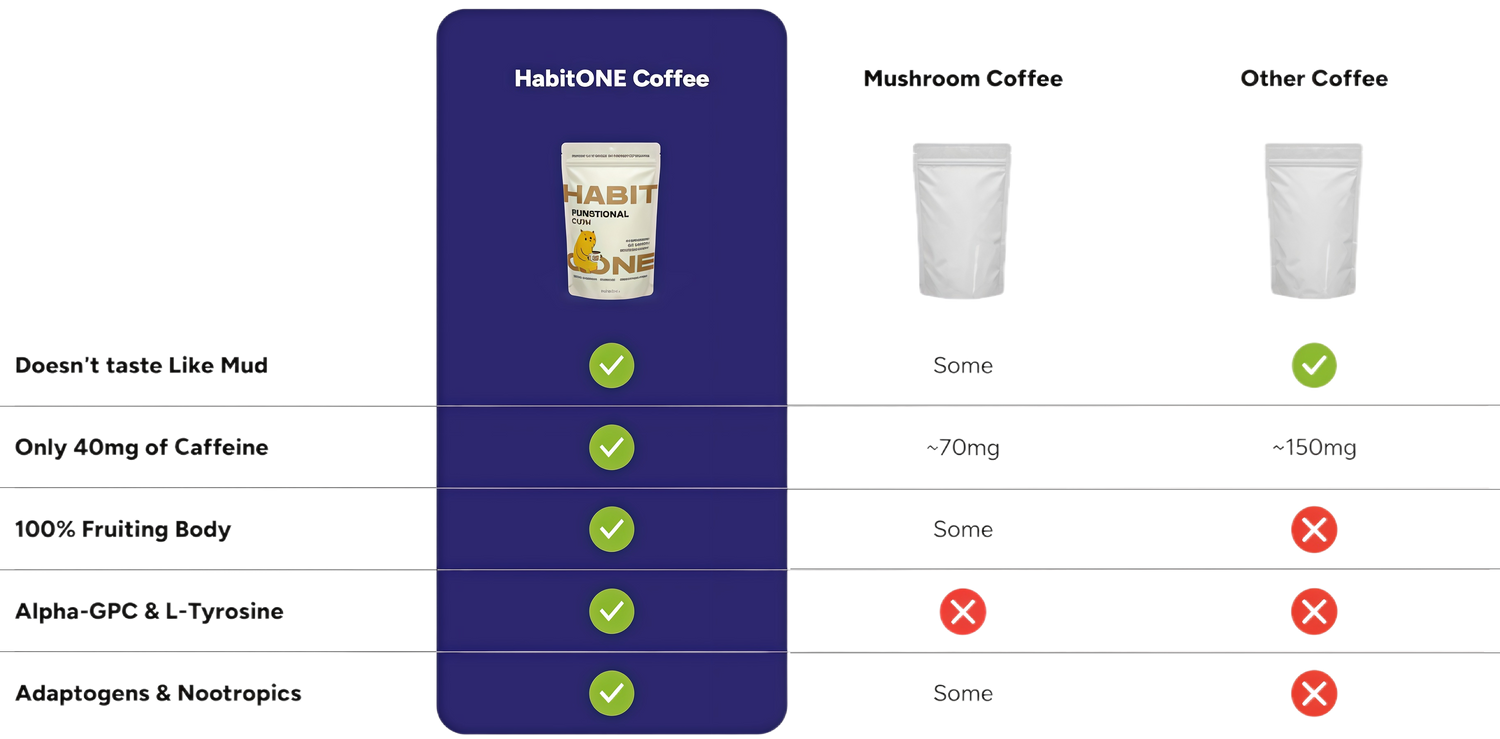 We kept the rich coffee flavor and steady energy you love — but removed the crash. HabitONE blends Lion’s Mane, Cordyceps, L-Tyrosine, and Alpha-GPC to calm cortisol, reduce bloat, and restore focus that lasts all day.