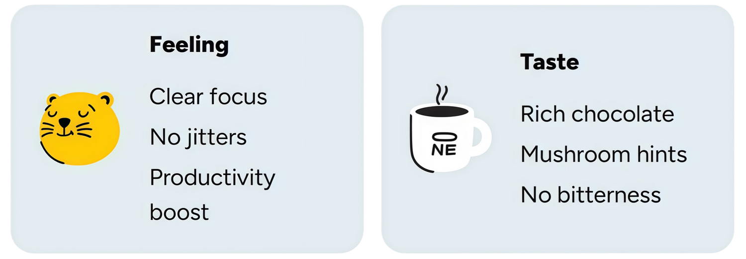 We kept everything you love about café-quality coffee — bold flavor, mood-boosting ritual, clean energy — and ditched the crash, jitters, and gut drama. Then we layered in research-backed doses of Lion’s Mane, Cordyceps, Chaga, and Reishi mushrooms plus nootropics (L-Tyrosine, Alpha-GPC, Rhodiola Rosea) for laser focus, calm clarity, immune support, and built-in stress resilience. Same habit, way more upside
